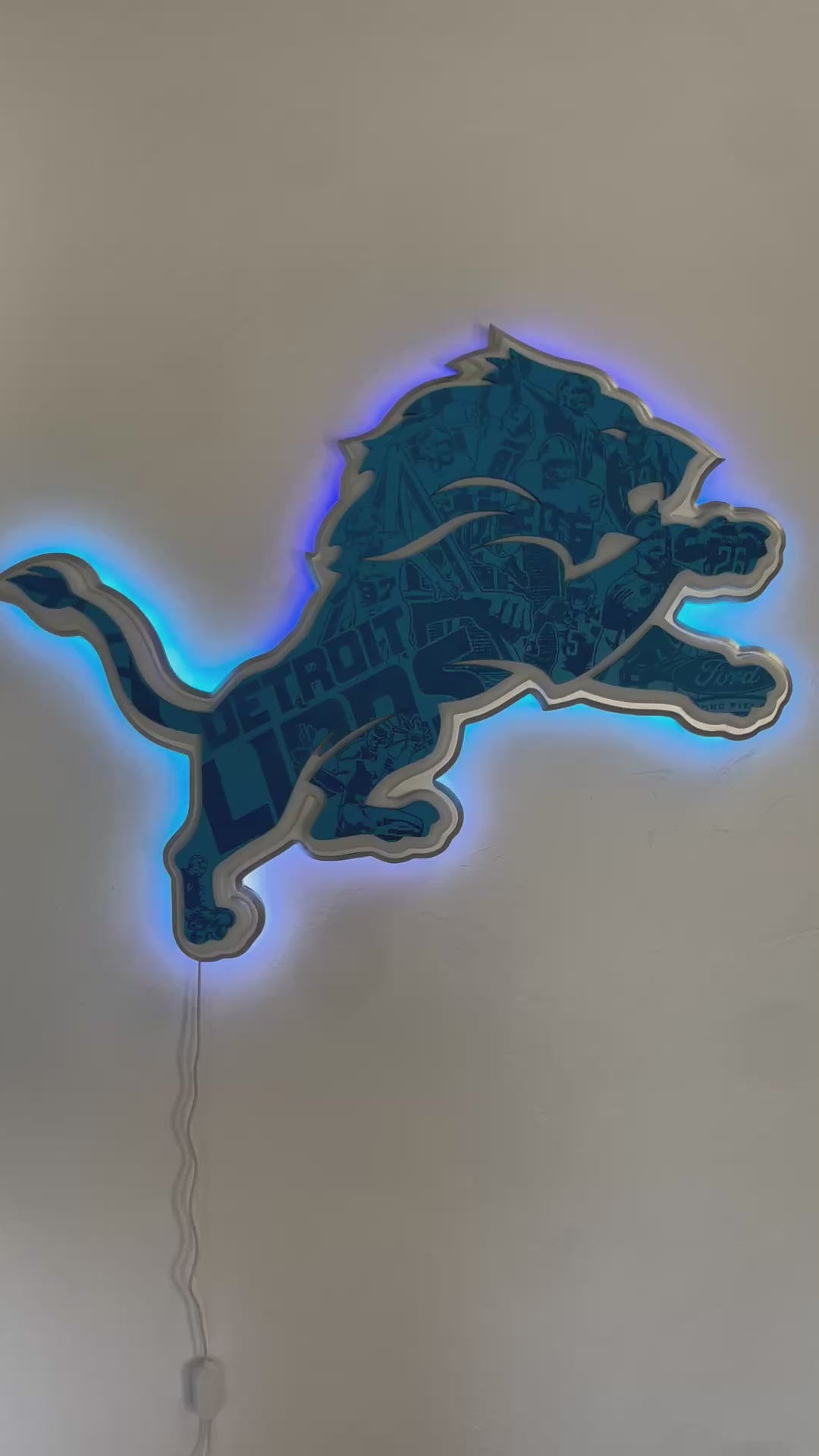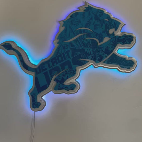 Detroit Lions sign with custom engraved details as seen in the pictures. Comes with LED lights on back. The LED lights can be controlled through an app or switch and fully customizable with multiple colors and can be music controlled. The sign is 33”, made to order and can include personalization upon request. Comes ready to hang.