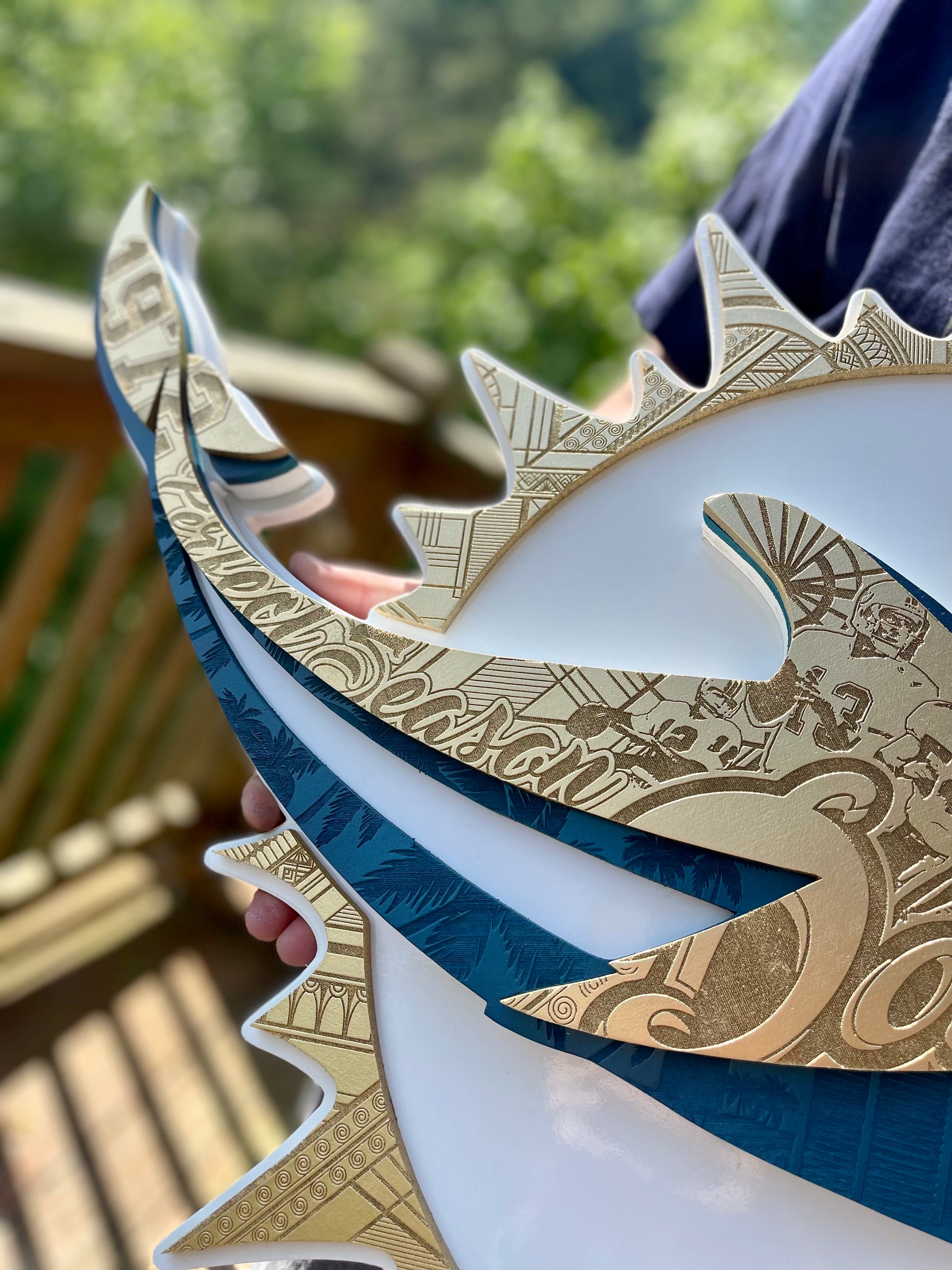 32”x 22” Miami Dolphins sign, gold, blue and white paint, with custom engraved details as shown in the picture. Comes with LEDs on the back. The LED lights can be controlled through an app and have “64 scenes” and music controlled.Made to order and can include personalization upon request. Comes ready to hang.