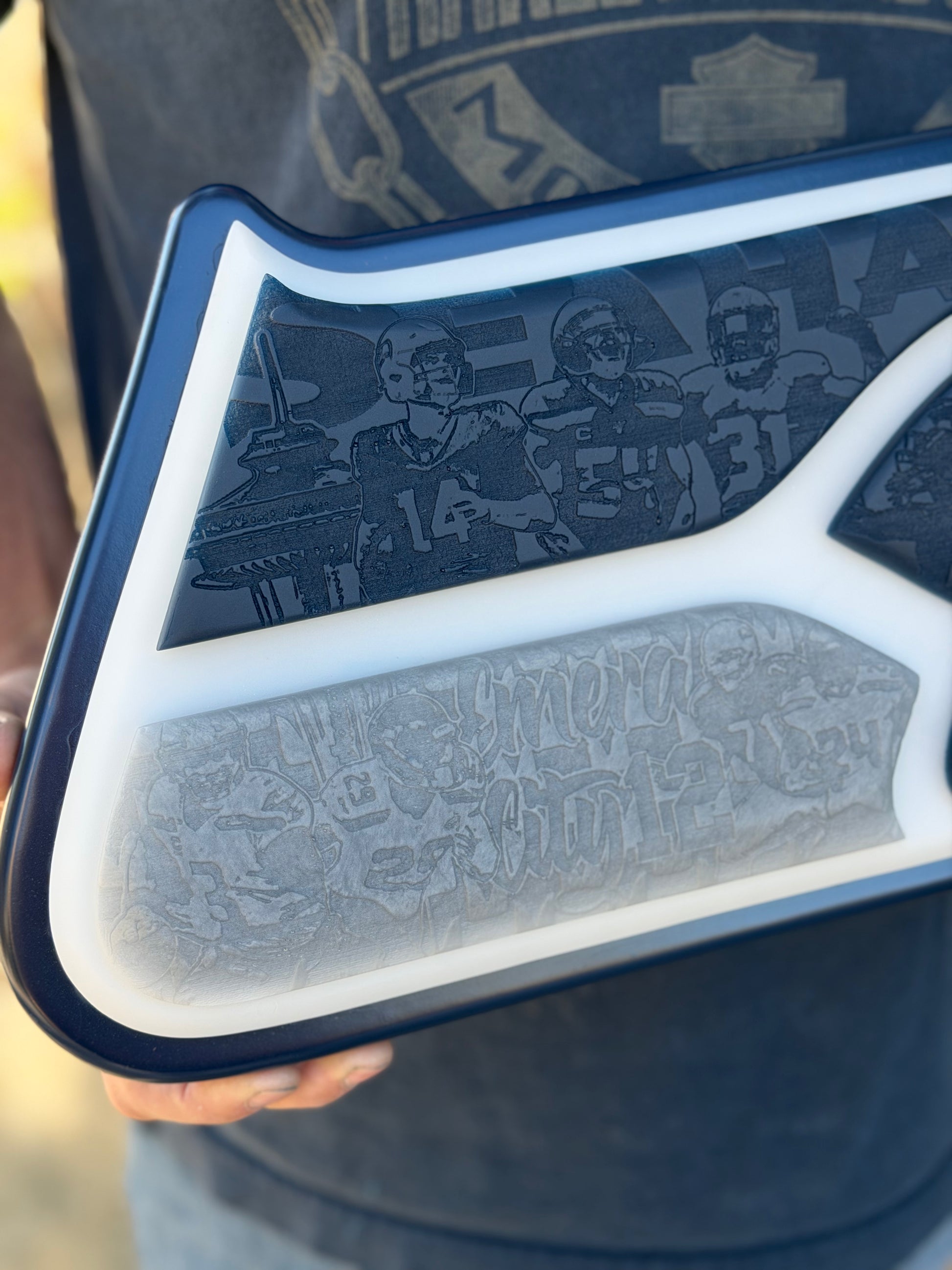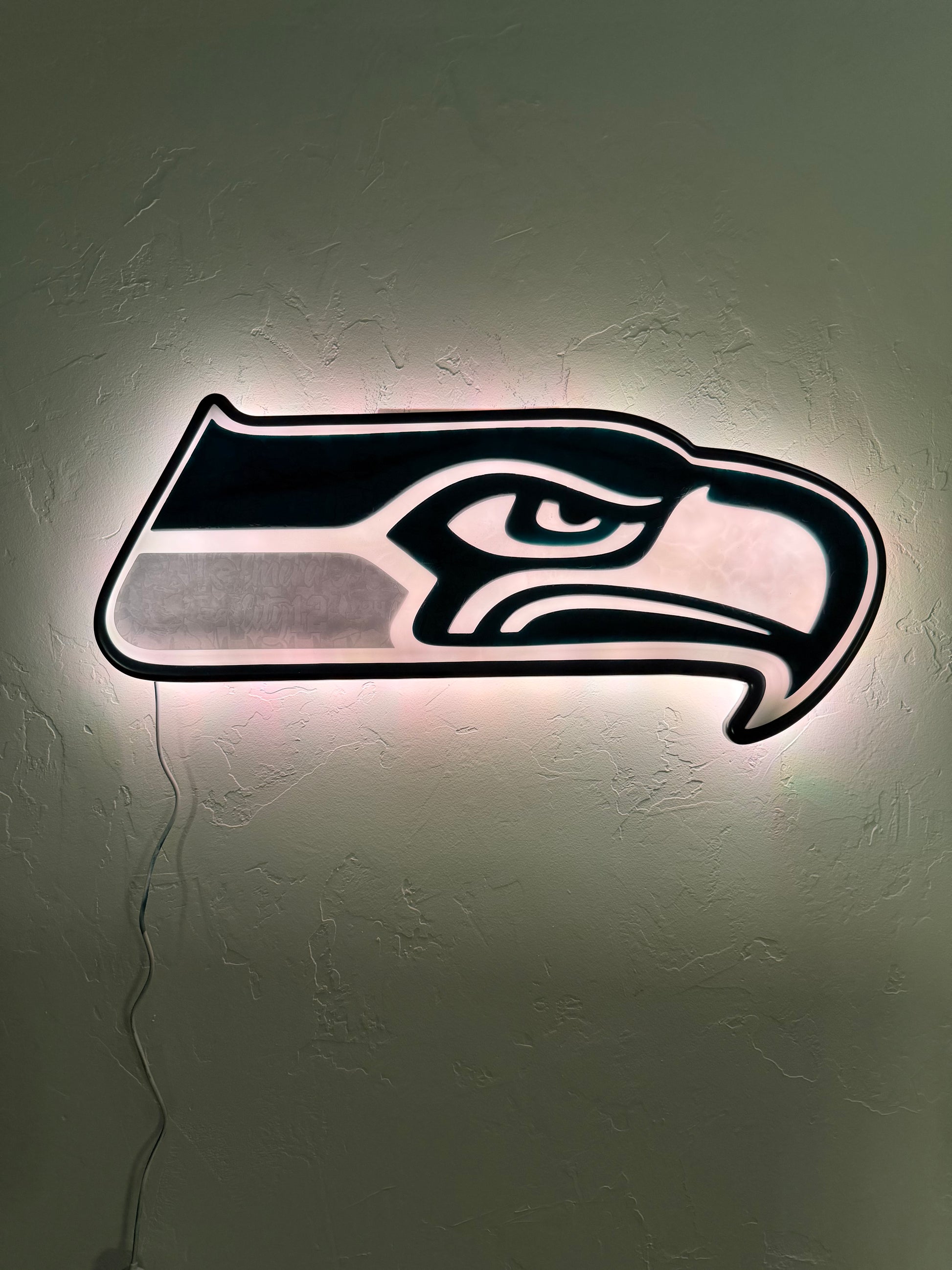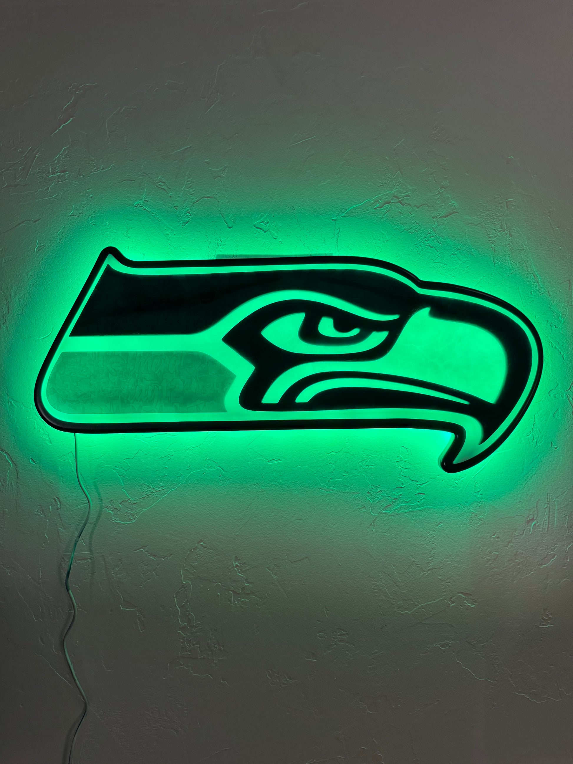 Seattle Seahawks LED sign with custom engraved details as shown in the pictures. Made from cast epoxy resin with composite wood base/frame. The LED lights can be controlled through an app or switch and fully customizable with multiple colors and can be music controlled. The sign is 23” and come ready to hang. Made to order