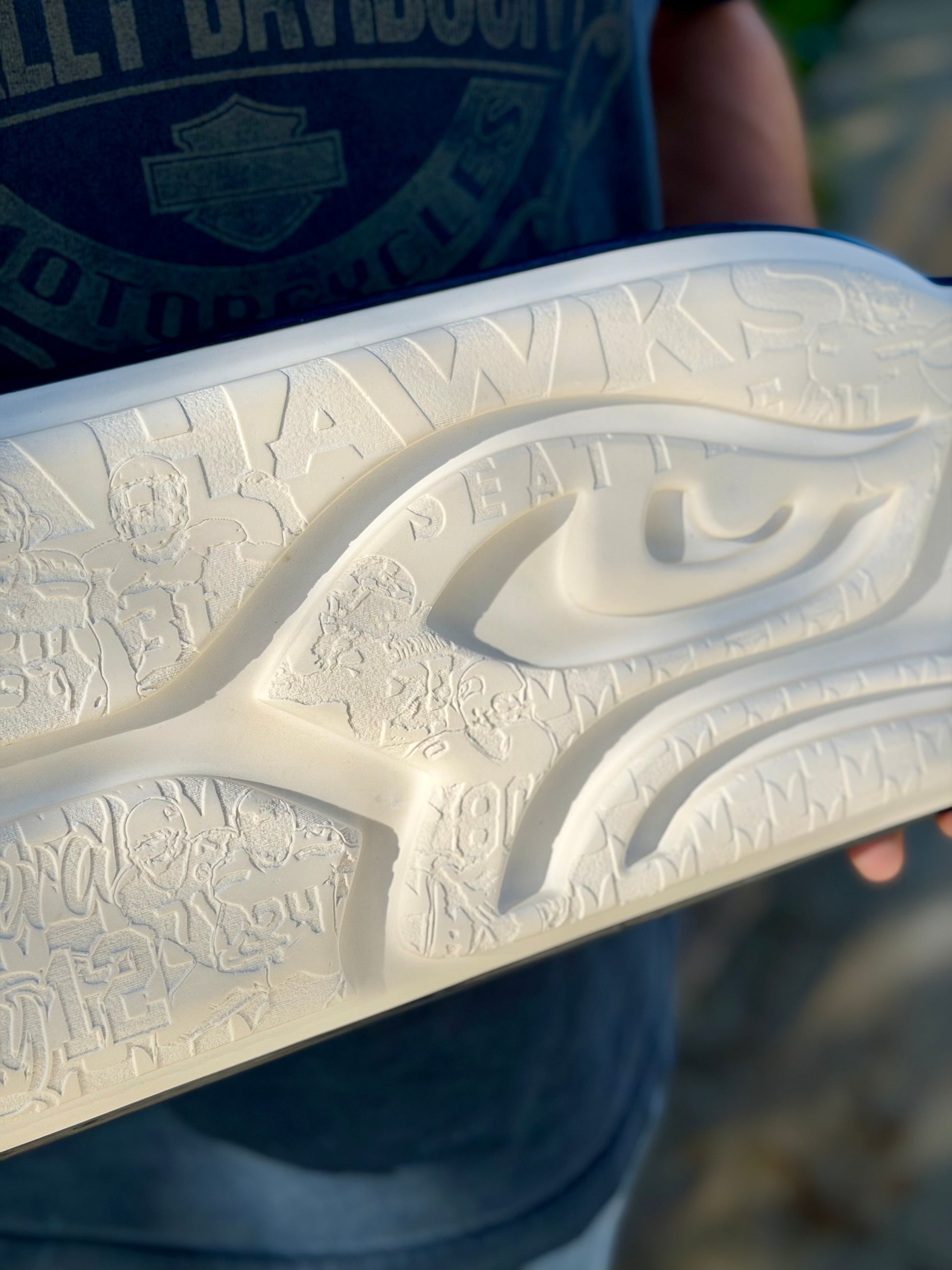 Seattle Seahawks “Stone” sign with custom engraved details as shown in the pictures. Made from cast Hydro-stone with composite wood base. Hydro-stone is an extremely hard high-strength gypsum cement. It provides a high-end luxury look of carved stone. The sign is 23” and comes ready to hang. Made to order